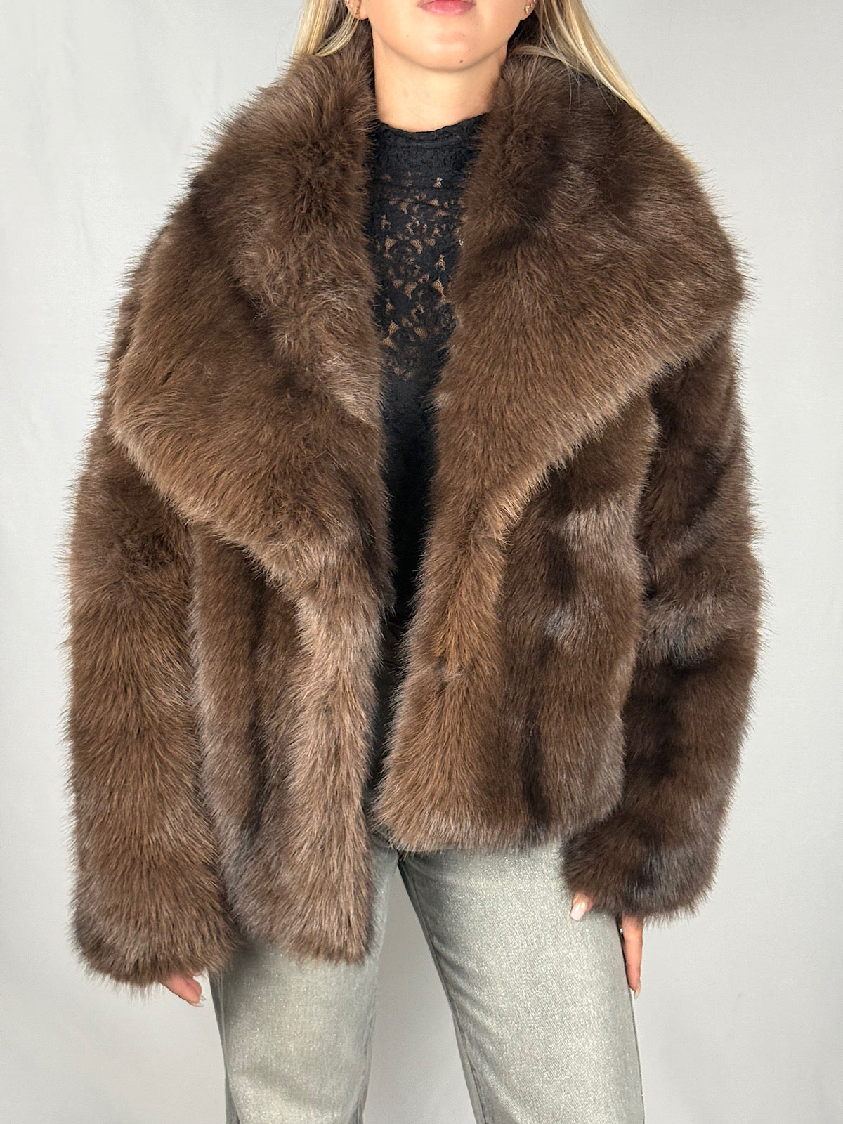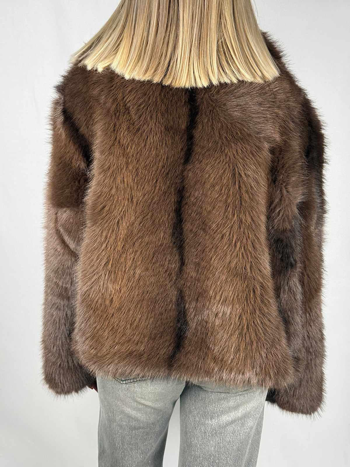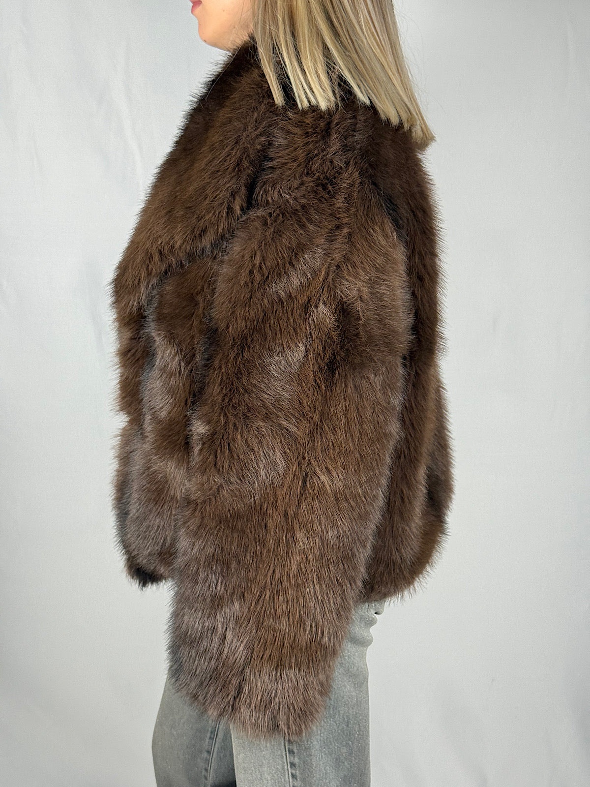 Pelliccia color nero, modello fit crop con collo revers, gancetto frontale e tasche laterali.