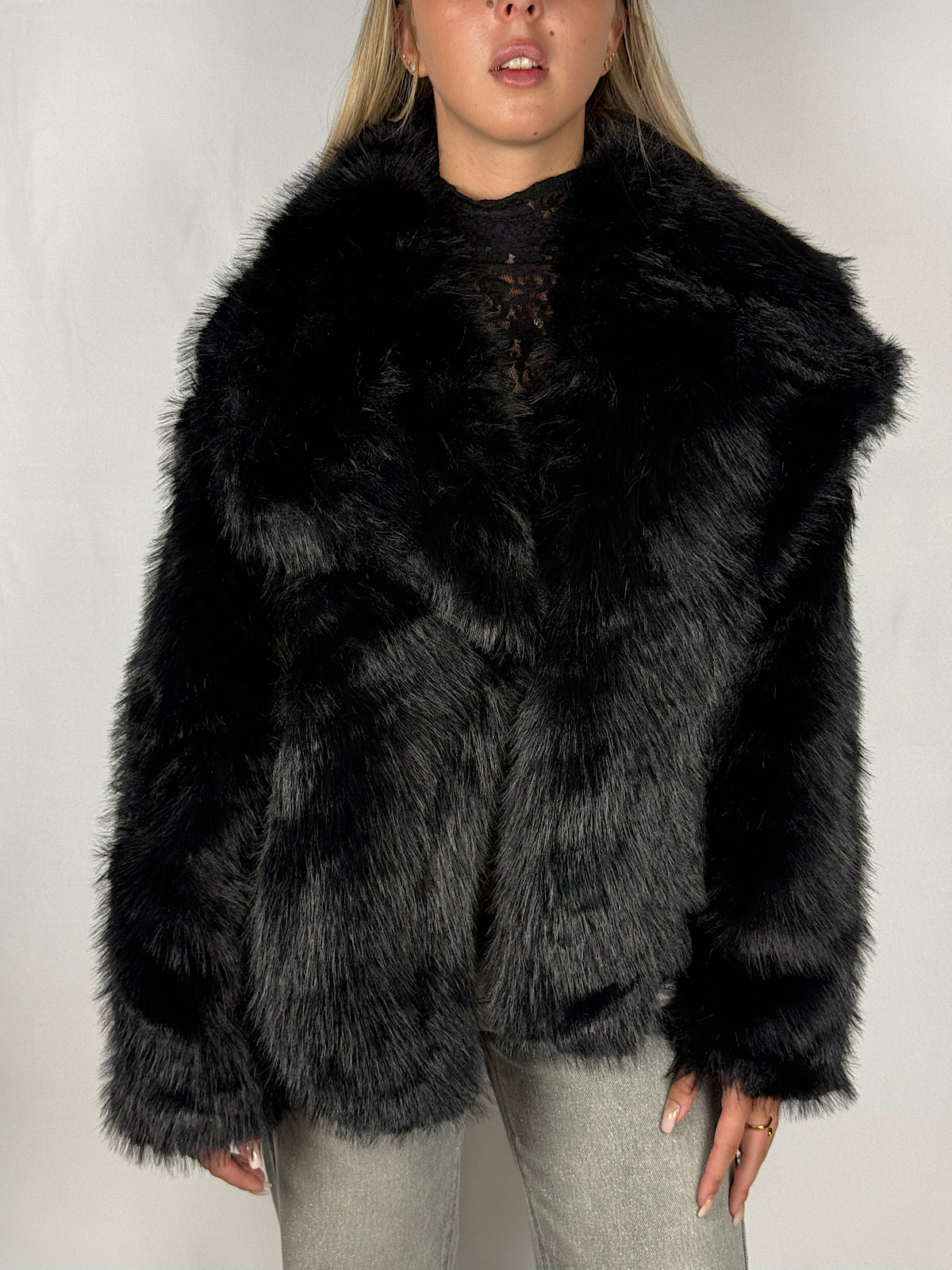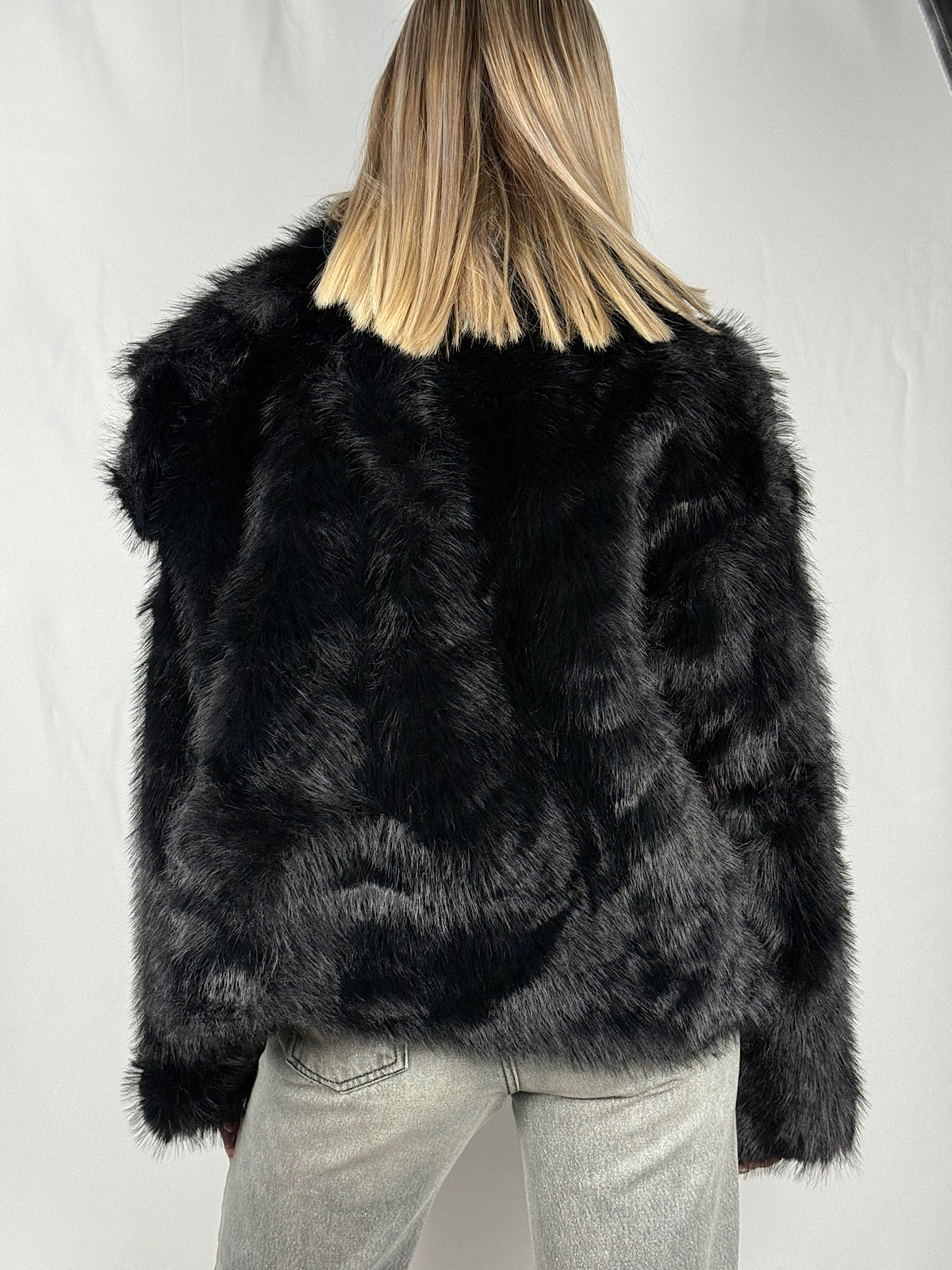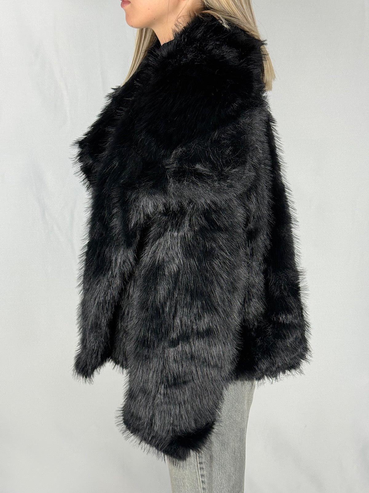 Pelliccia color nero, modello fit crop con collo revers, gancetto frontale e tasche laterali.