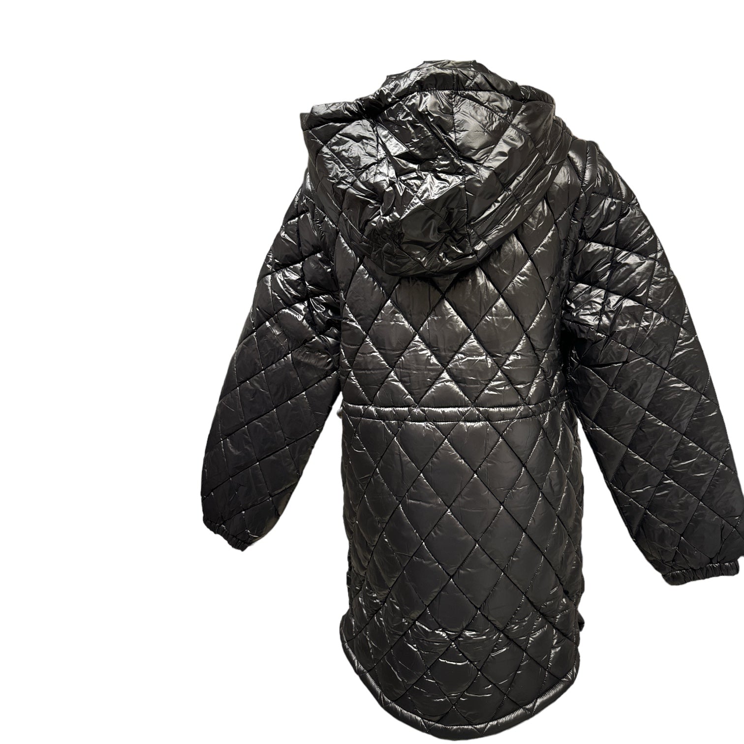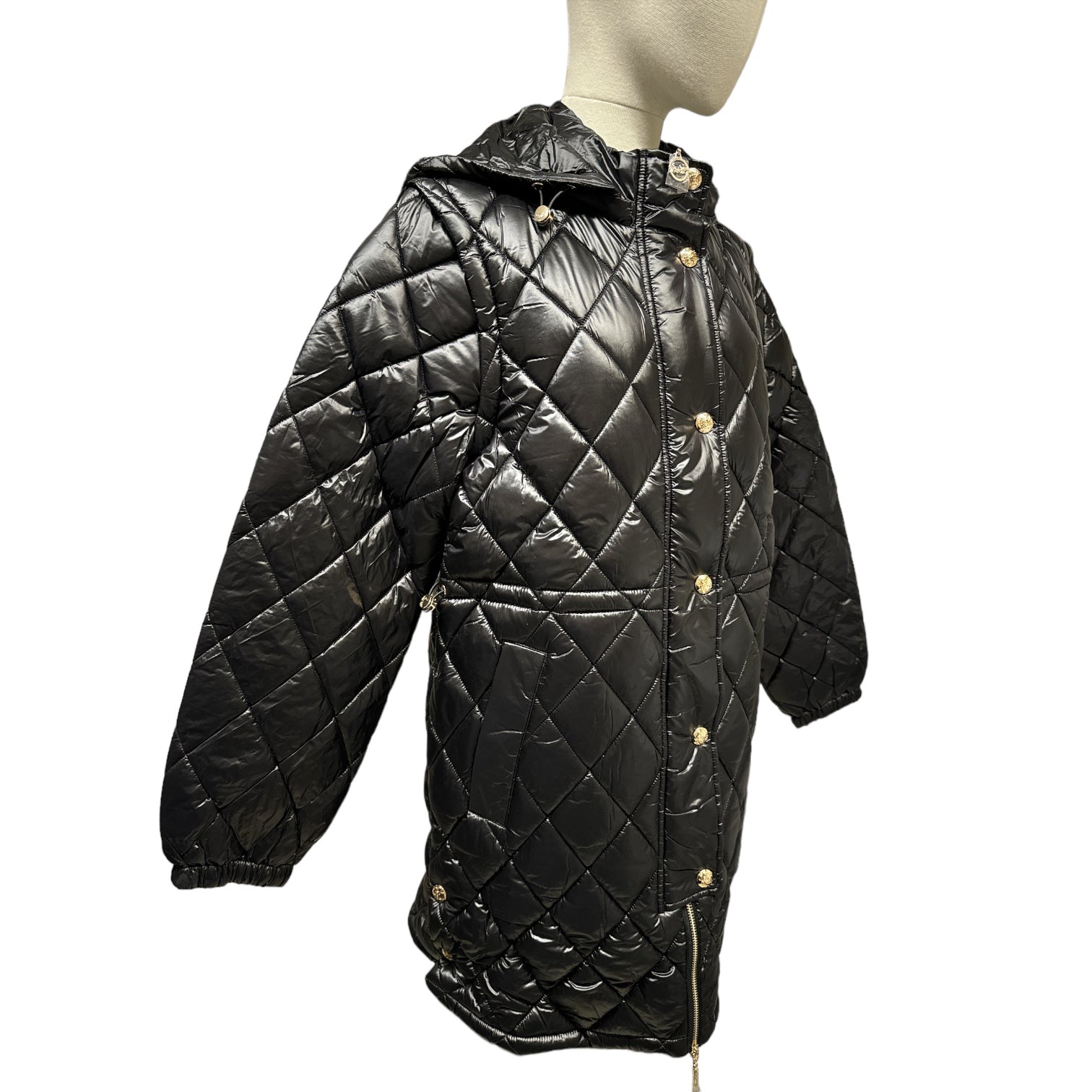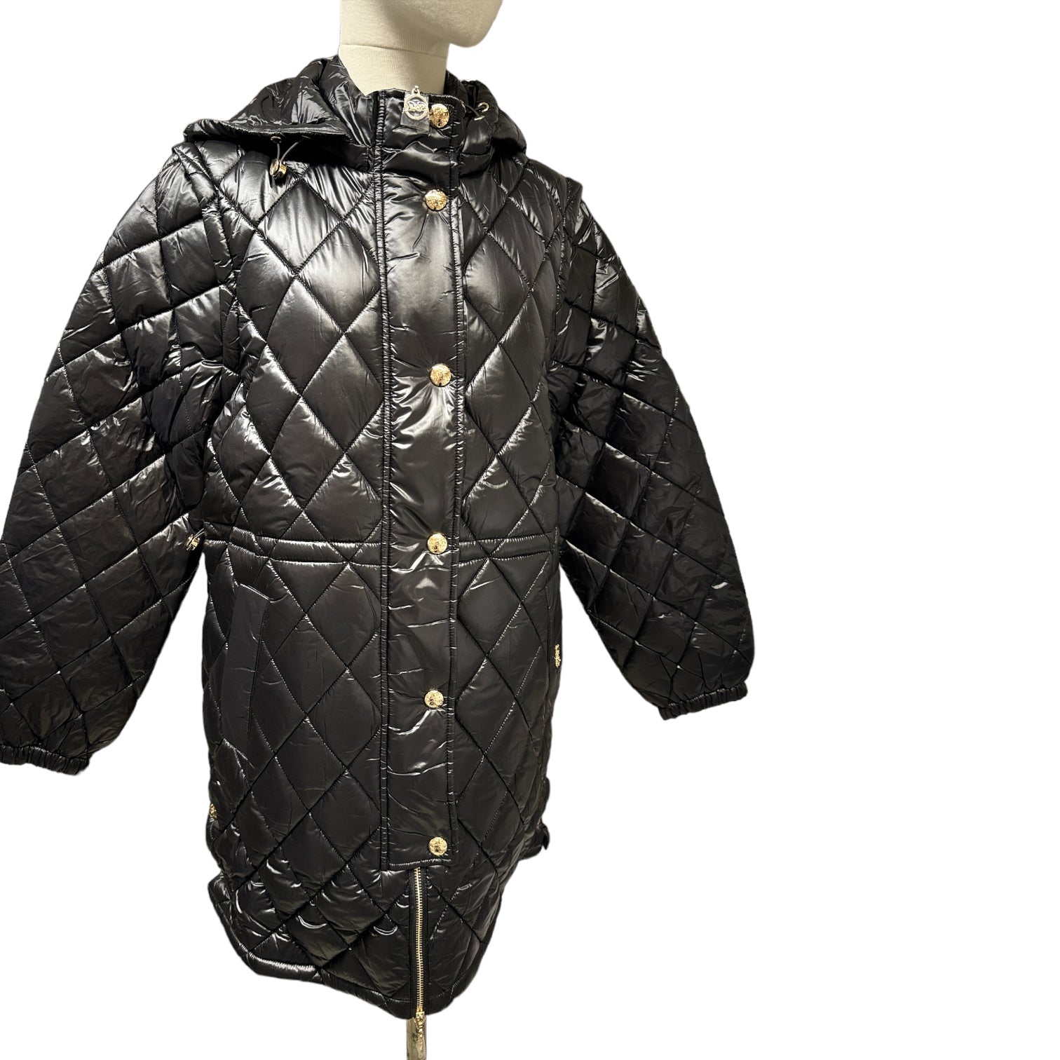 Piumino con cappuccio regolabile con coulisse e removibile con zip, maniche removibili con zip, coulisse in vita, due tasche frontali con targhetta logo applicata su quella sinistra, chiusura frontale con zip e bottoni a pressione, spacchi laterali con bottoni a pressione