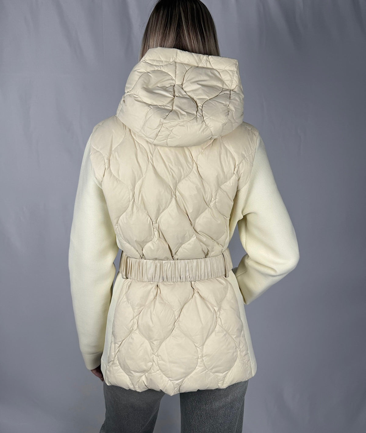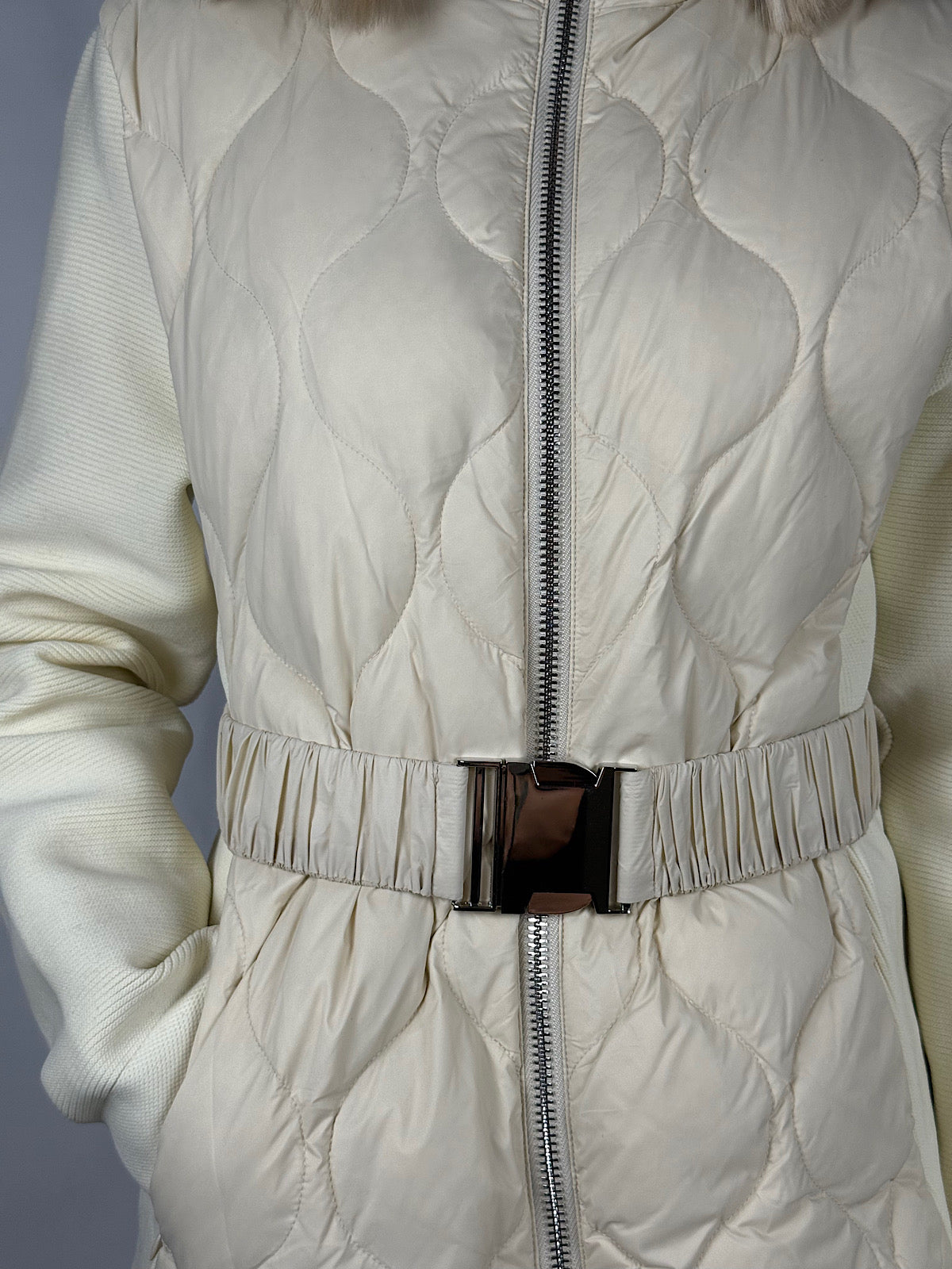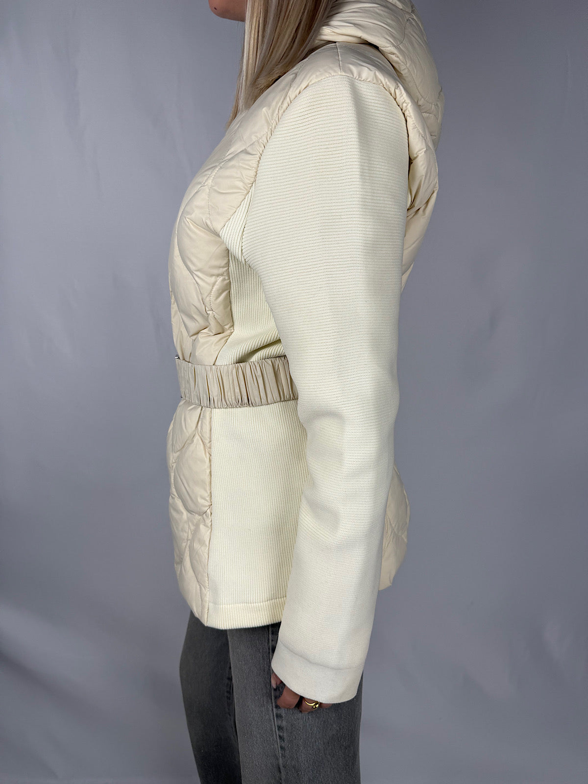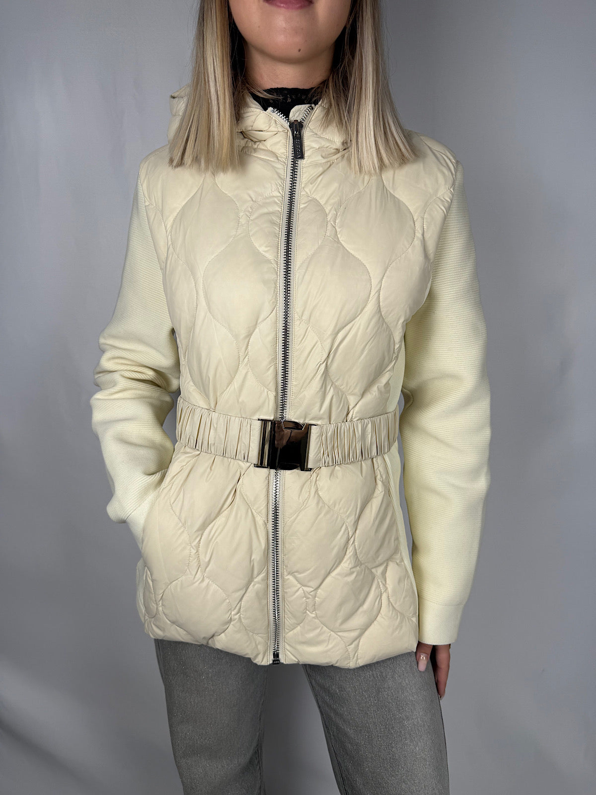 Giacca con maniche in cotone, chiusura con cintura e fibbia a scatto in vita.