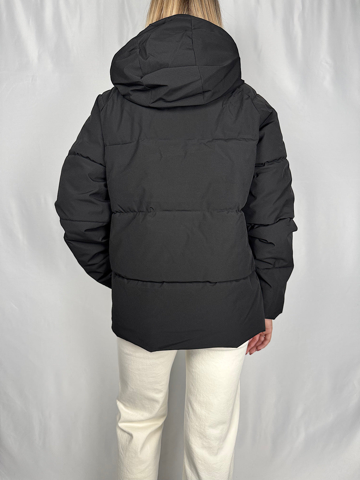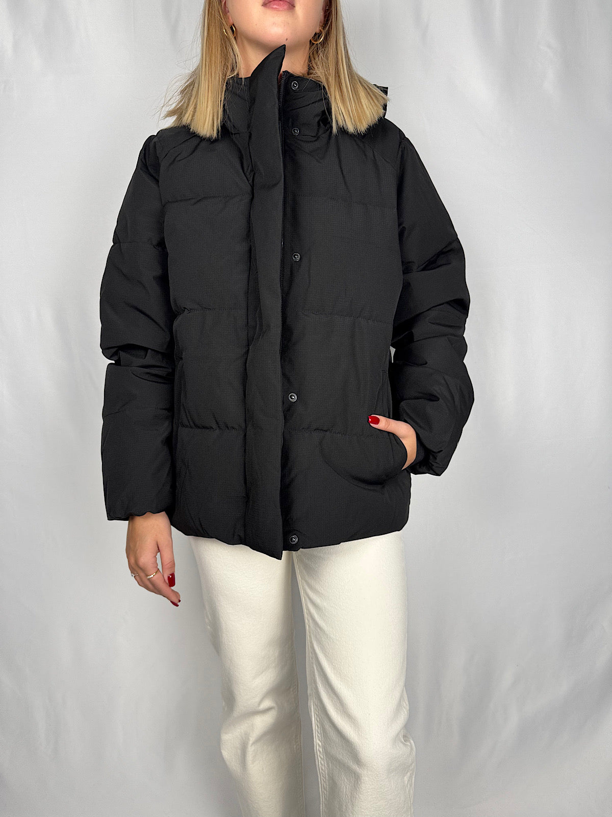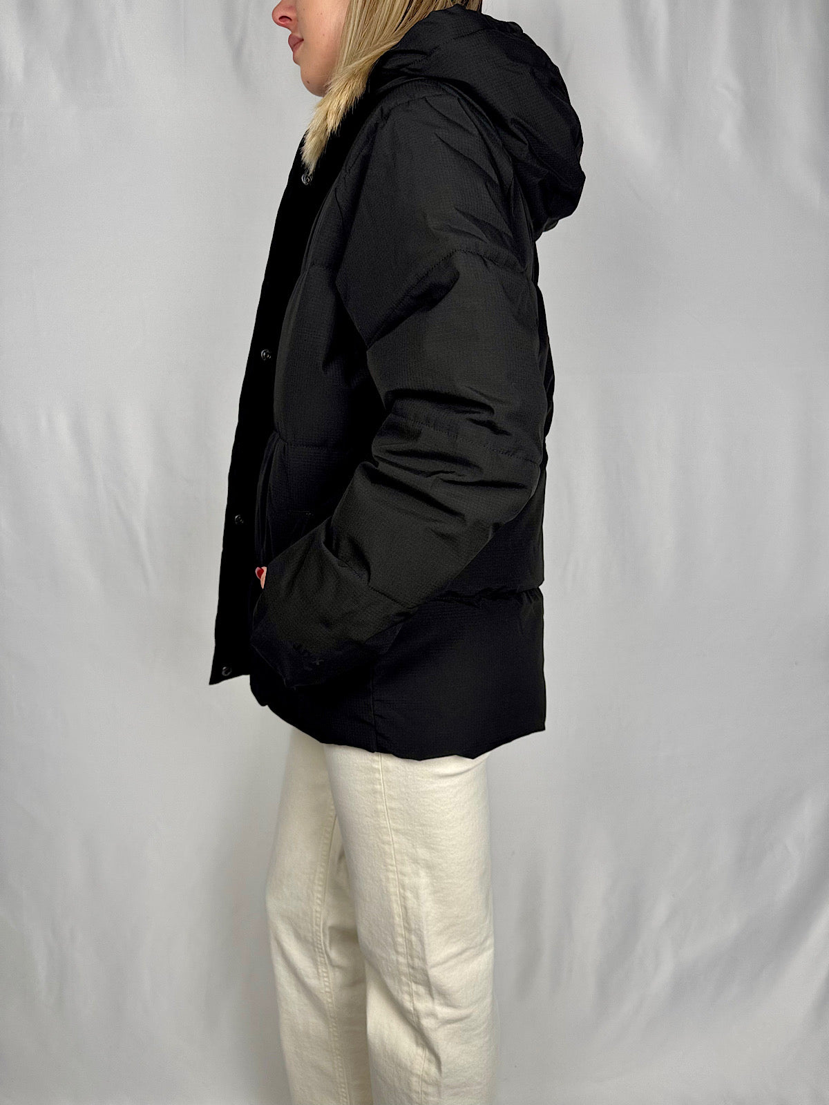 Piumino imbottito con chiusura a bottone e zip. Cappuccio con coulisse.