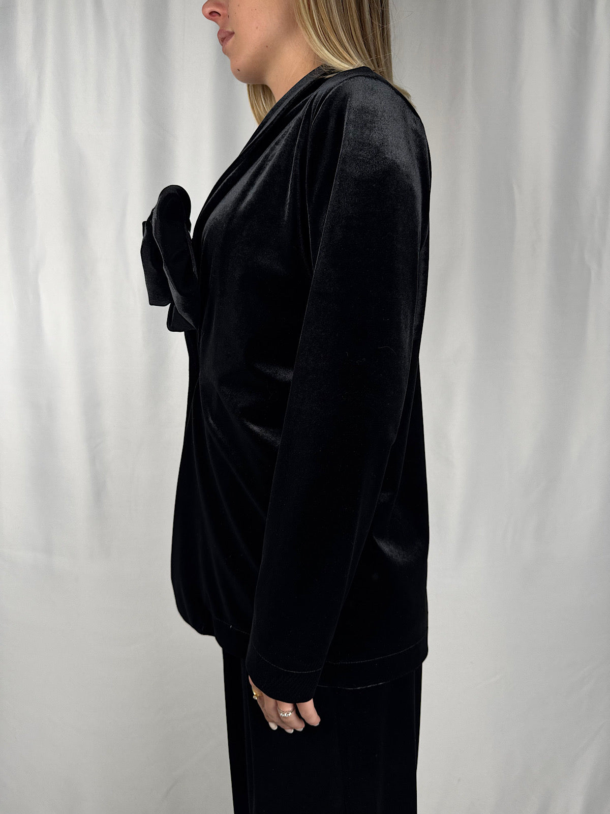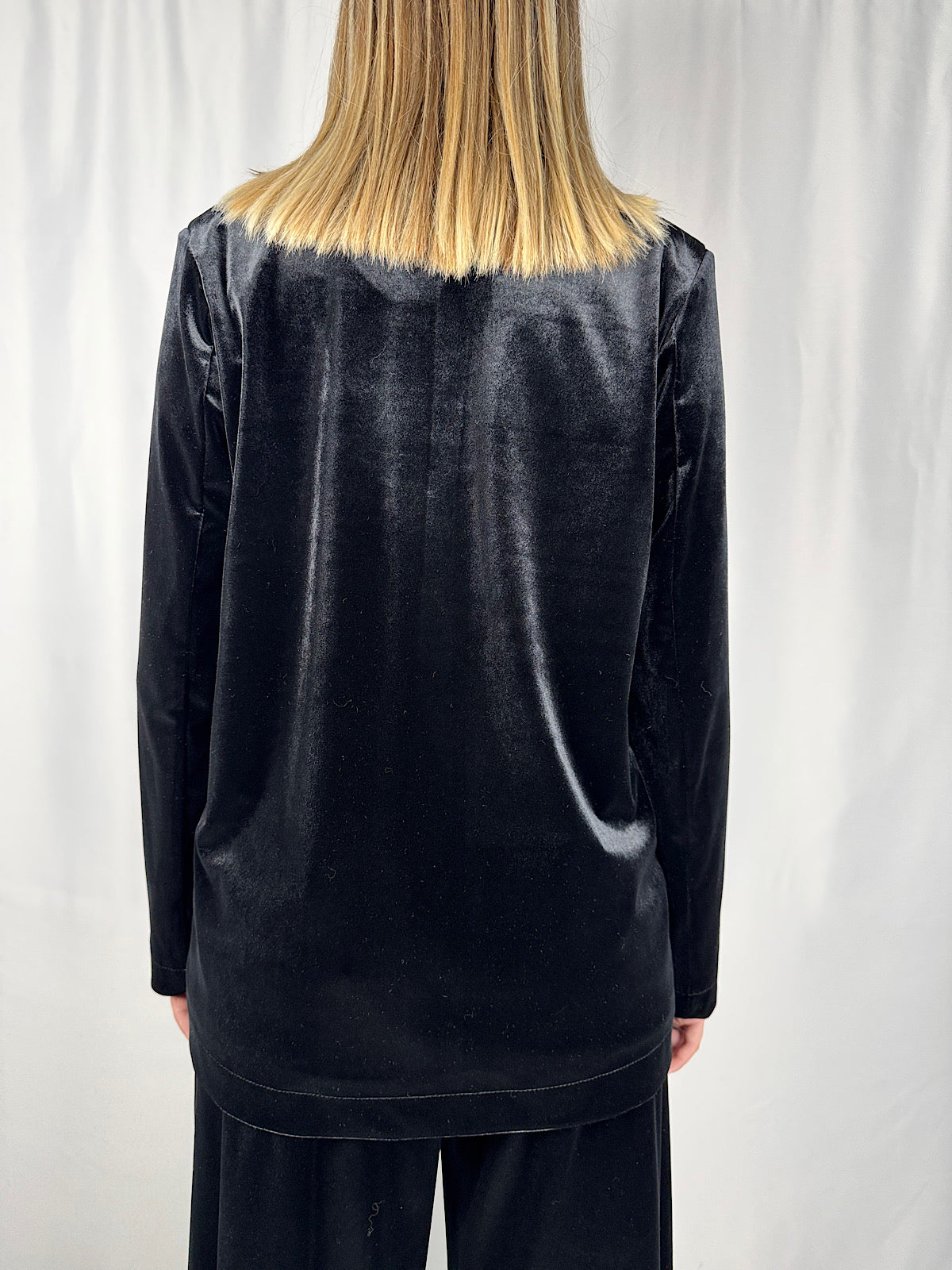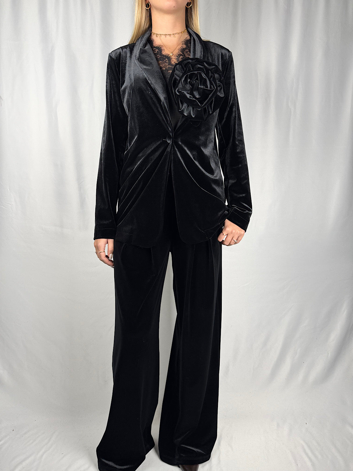 Giacca in velluto con chiusura a bottone. Spilla con rosa removibile