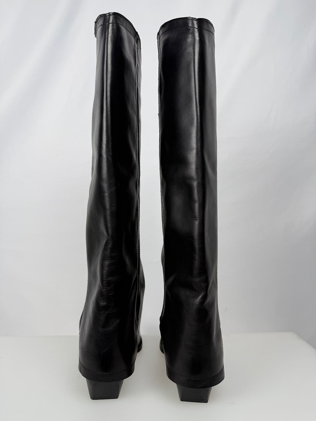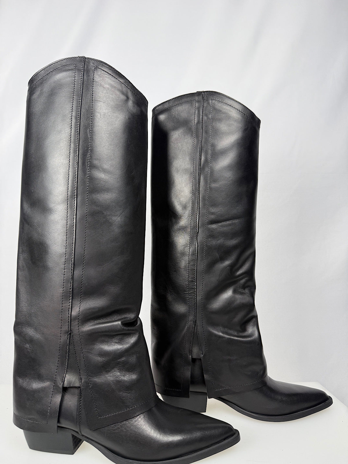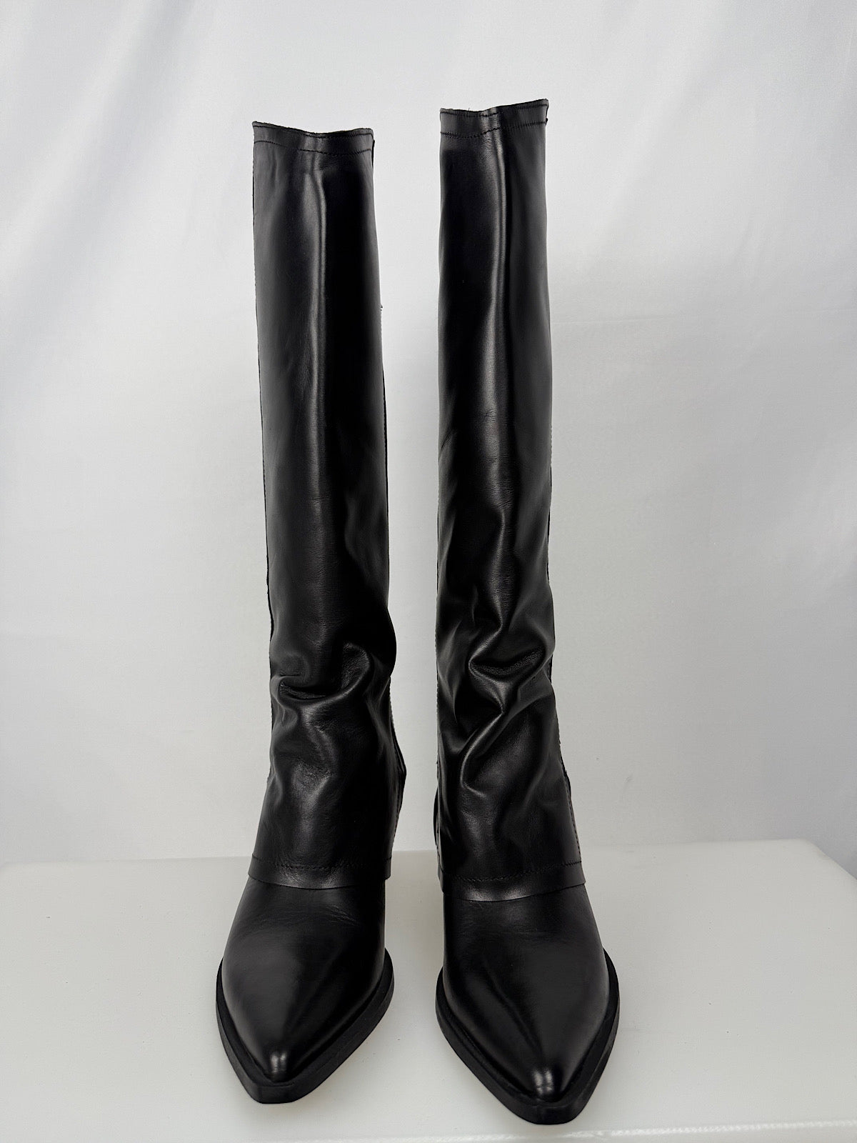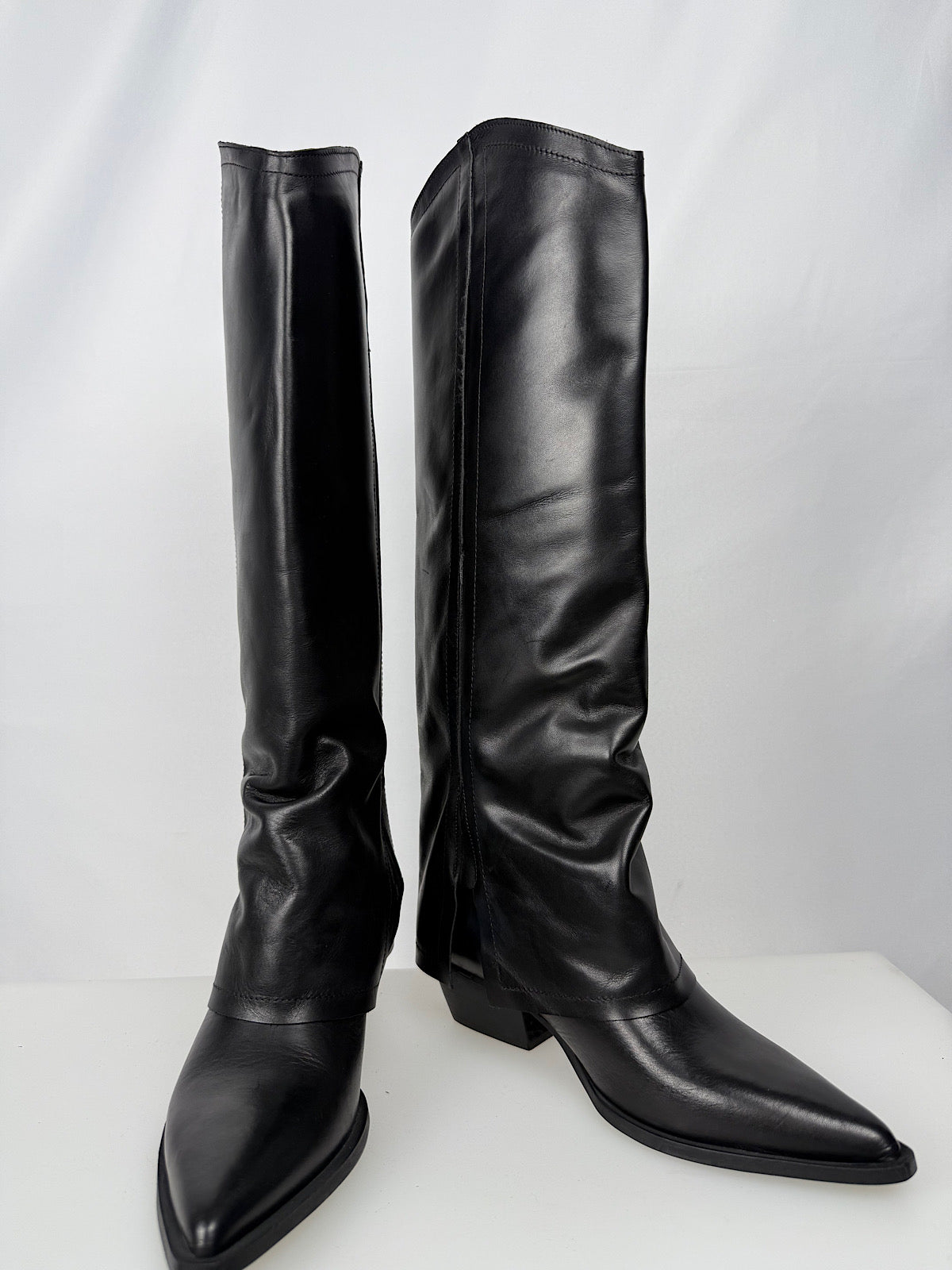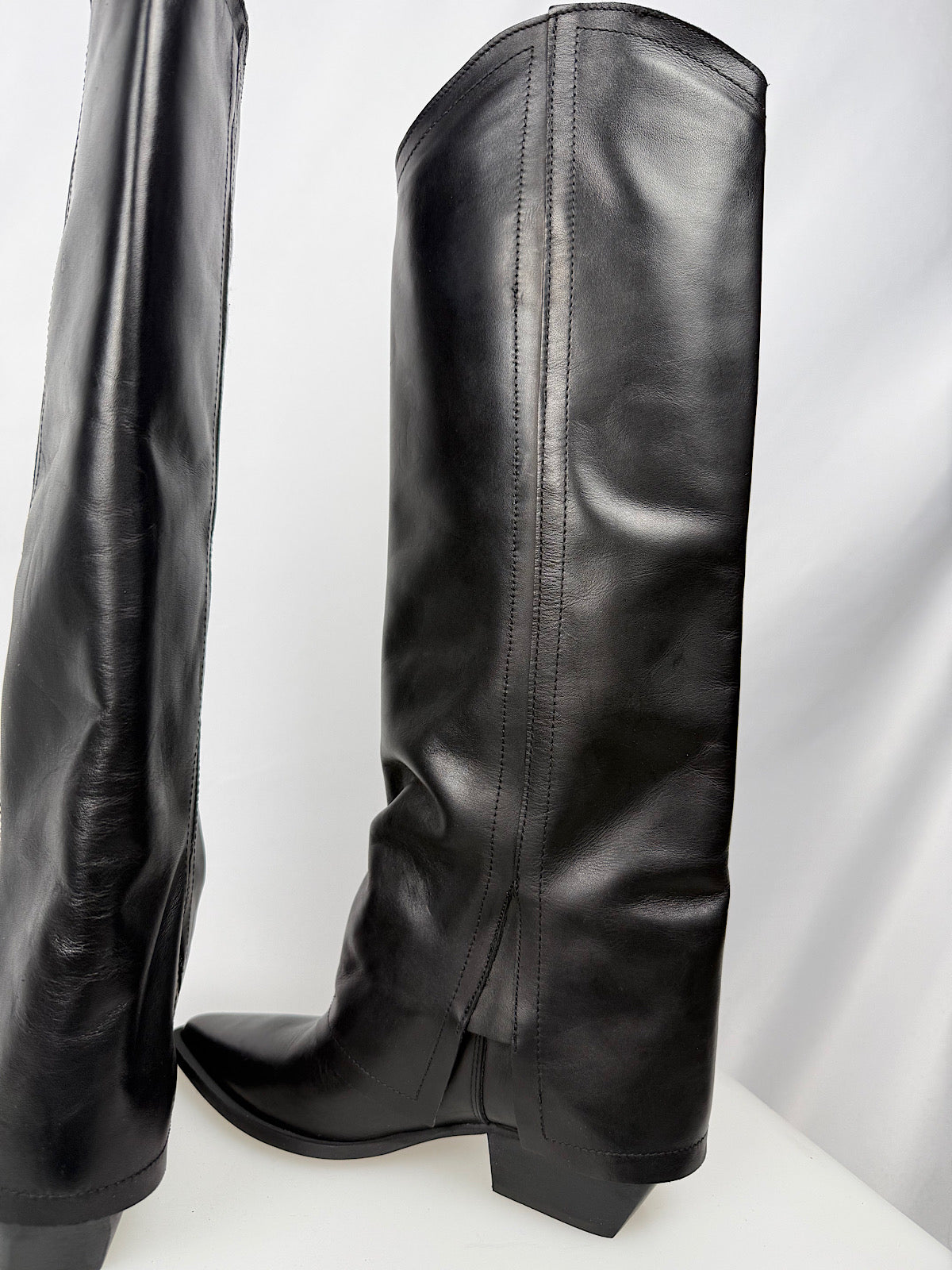 Stivale alto in pelle liscia con rovescia e tacco alto 3cm.