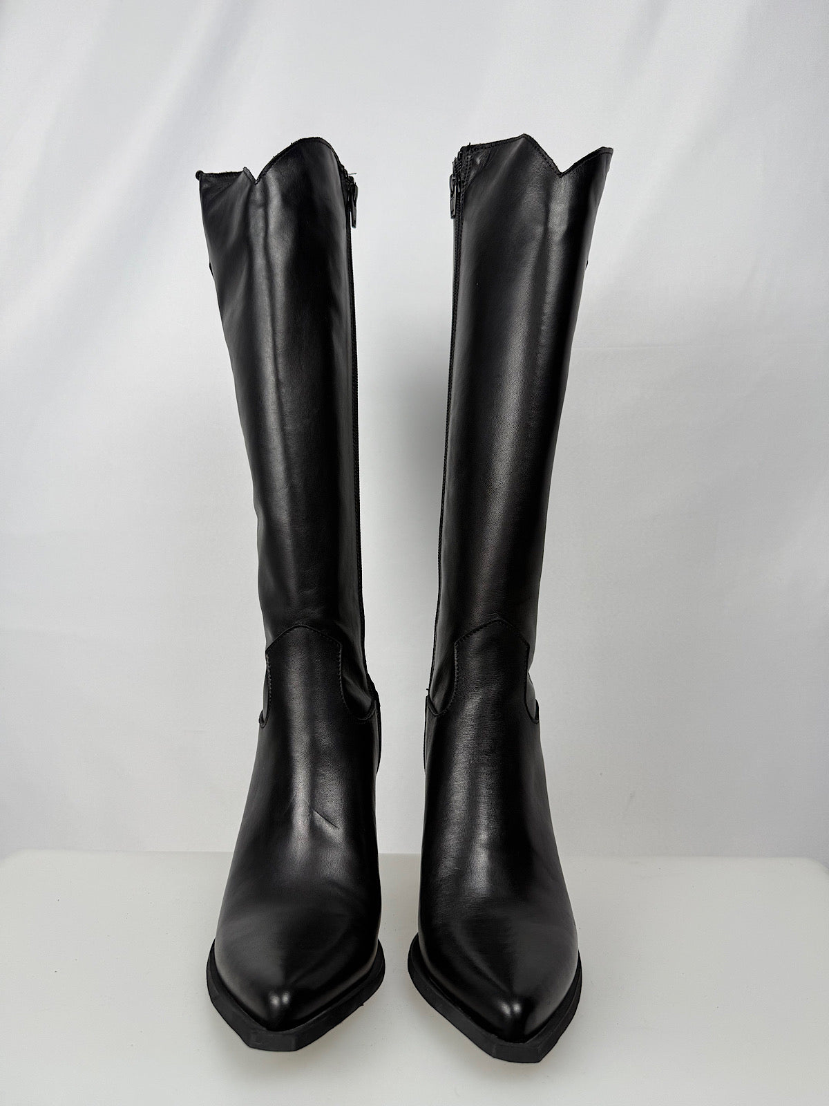 Stivale alto in pelle liscia con tacco rettangolare altezza 8cm.