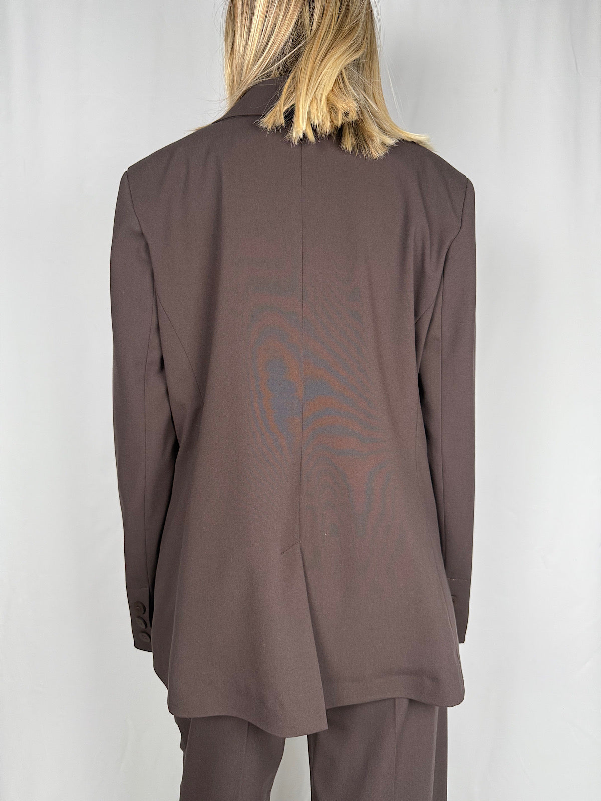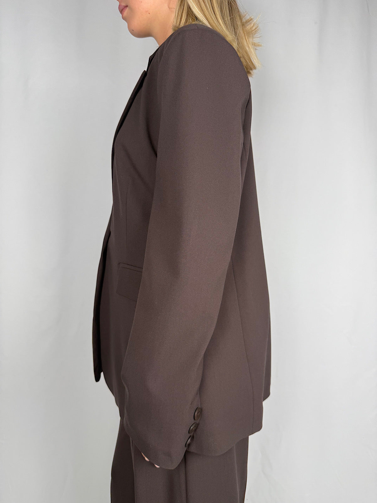 Giacca monopetto chiusura a bottone marrone. Dettaglio polso con tre bottoni